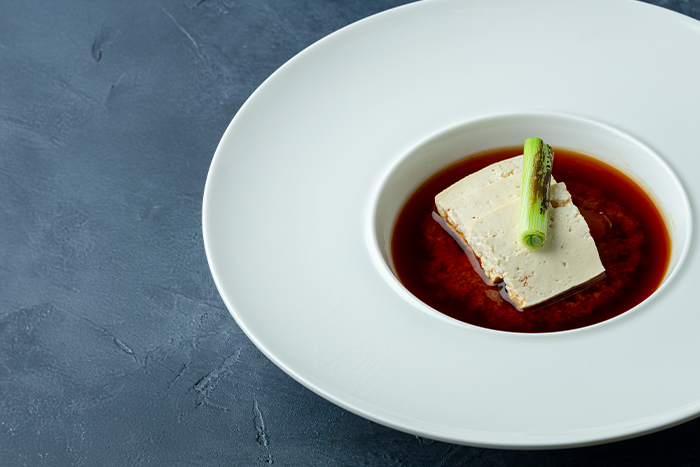 Kanpachi. Avocado. Tomato. Tenkasu. Escabeche Lilikoi Amarillo.