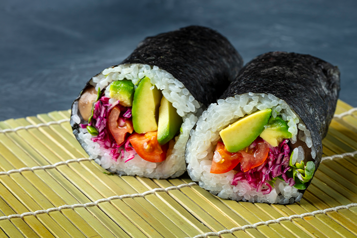 Rice and Nori topped with Shimeji Mushroom. Avocado. Tomato. Negi. Pickled Cabbage. Maize Sauce.