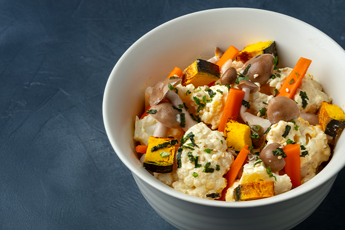 Cauliflower. Shimeji Mushroom. Gobo. Calabaza. Furikake. Maize Sauce.